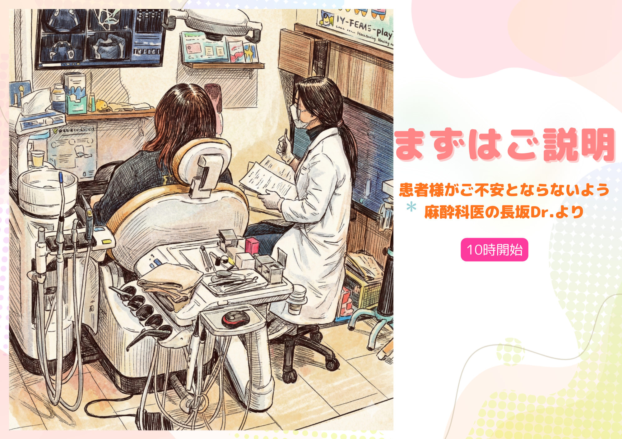 実際にどのような雰囲気で治療が行われたのか、本日の臨床風景(イラスト)とともに、その安心の理由をご紹介します。