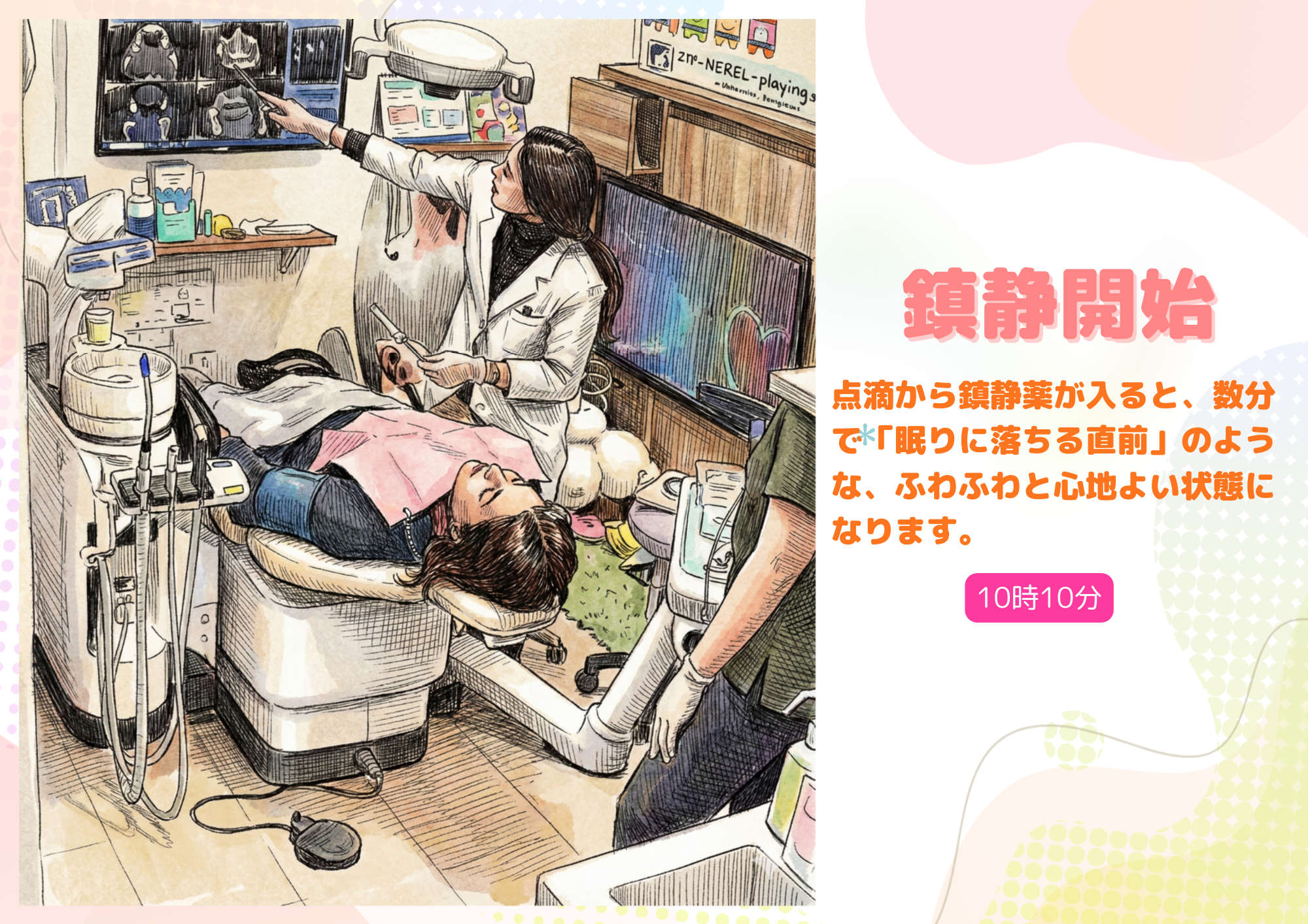 点滴から鎮静薬が入ると、数分で「眠りに落ちる直前」のような、ふわふわと心地よい状態になります。