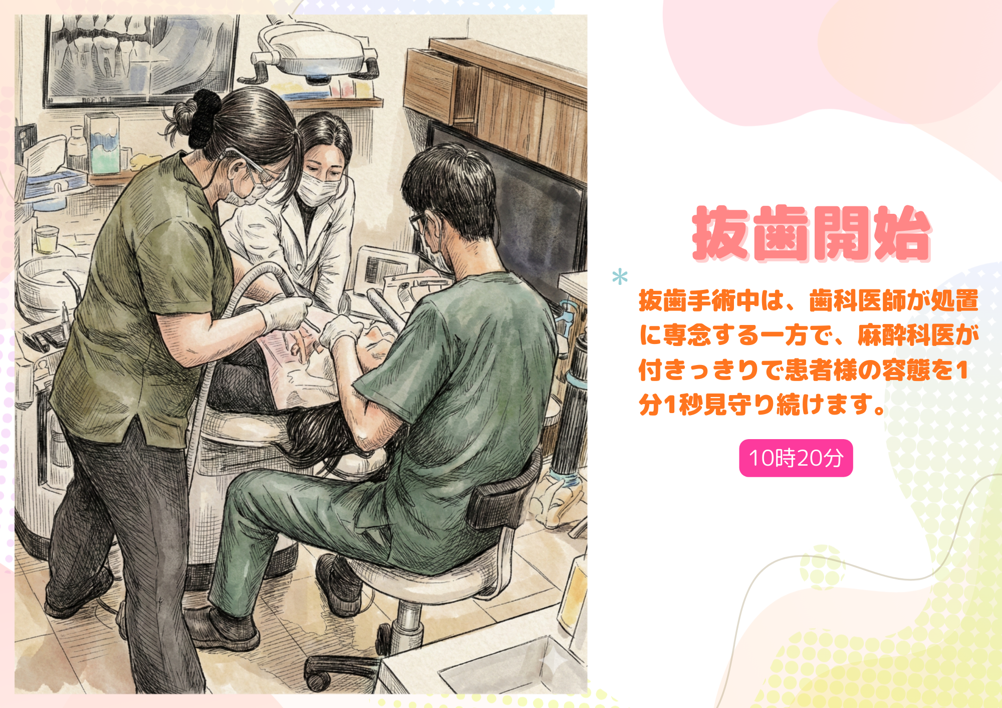 抜歯手術中は、歯科医師が処置に専念する一方で、麻酔科医が付きっきりで患者様の容態を1分1秒見守り続けます。