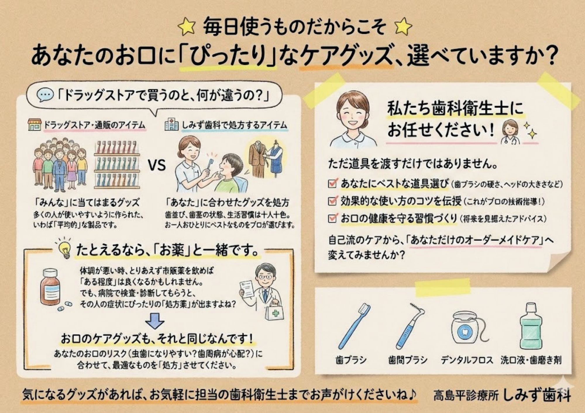 2. 「物販」ではなく「処方」という考え方 当院は、単に歯ブラシを売る場所ではありません。