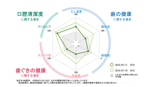 アンモニアの数値が高いとお口の中に細菌が多く存在する可能性があり、清潔さを示す指標となります。また、アンモニアは口臭の原因の一つでもあるため、数値が高い場合、口臭が発生している可能性があります。